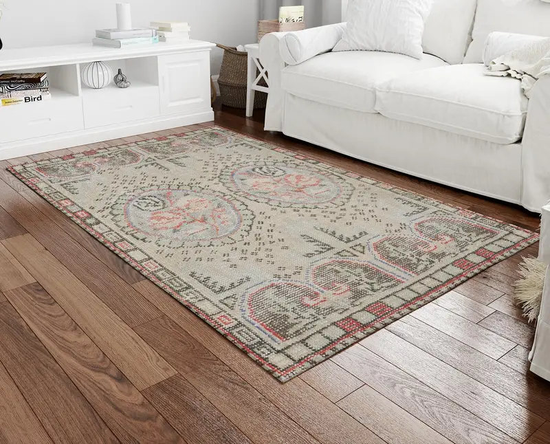 緑と赤の花柄プリント ラグ、ヴィンテージ トルコ スタイル デザイン