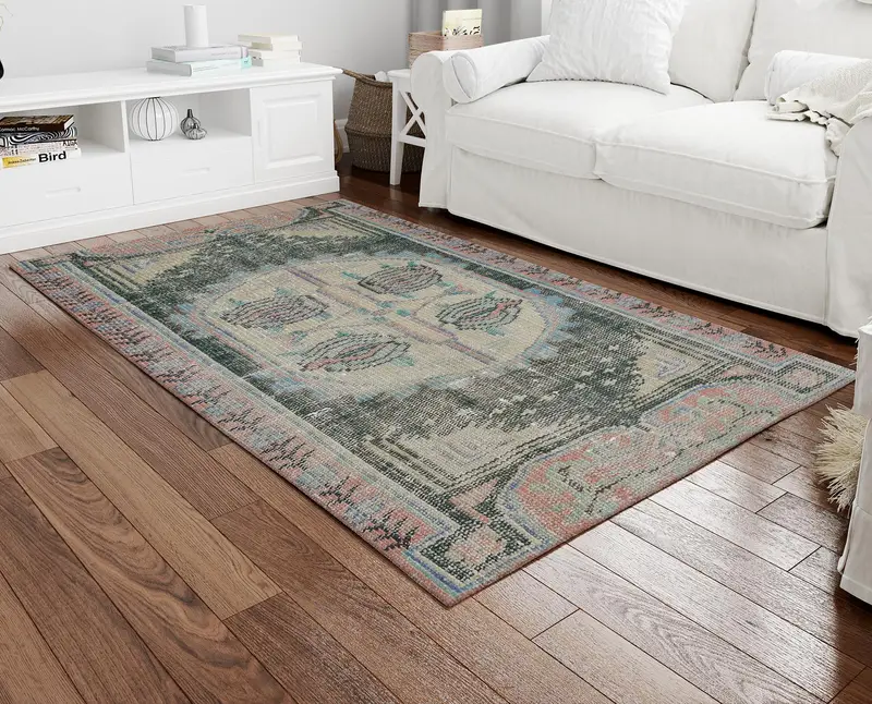 グリーン & ベージュのヴィンテージ プリント ラグ: ご家庭用のモダンなエレガンス