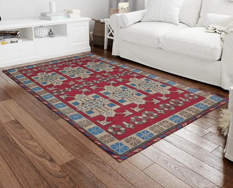 ブルー & レッドの幾何学模様のヴィンテージ トルコ プリント ラグ