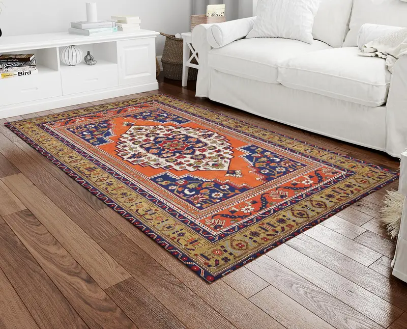 ヴィンテージ花柄ラグ、オレンジとブルーの色合い、プリントデザイン