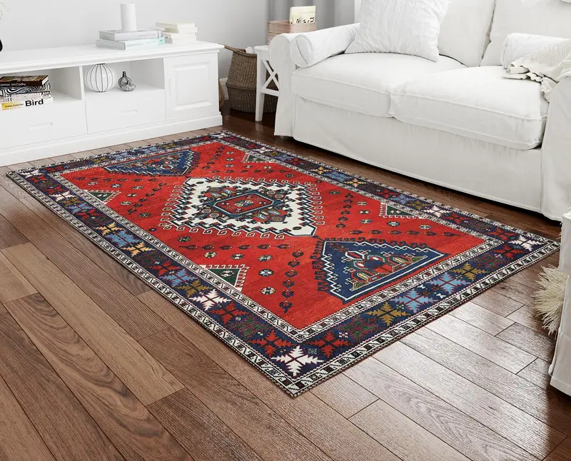 ヴィンテージレッド&ブルートルコ柄プリントラグ、ベージュアクセント