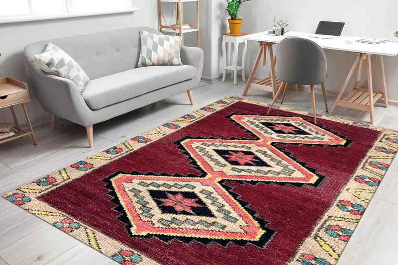 レッド&ピンクの幾何学模様のヴィンテージプリントラグ、トルコデザイン、ベージュの色合い