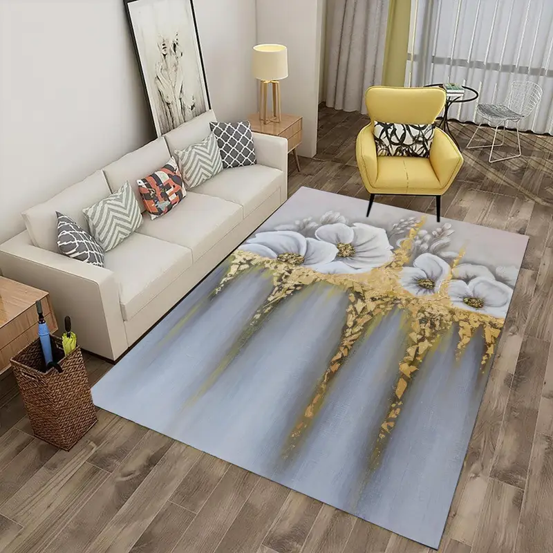 花柄ゴールドアクセントプリントラグ、モダンホワイトラグジュアリーデザイン
