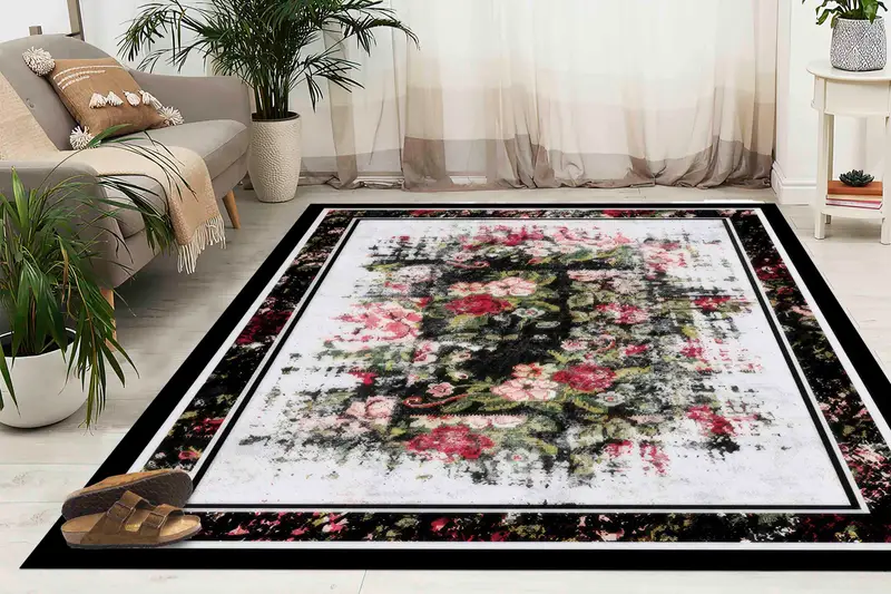 抽象的なモダンなブラック花柄プリントラグ - エレガントな室内装飾