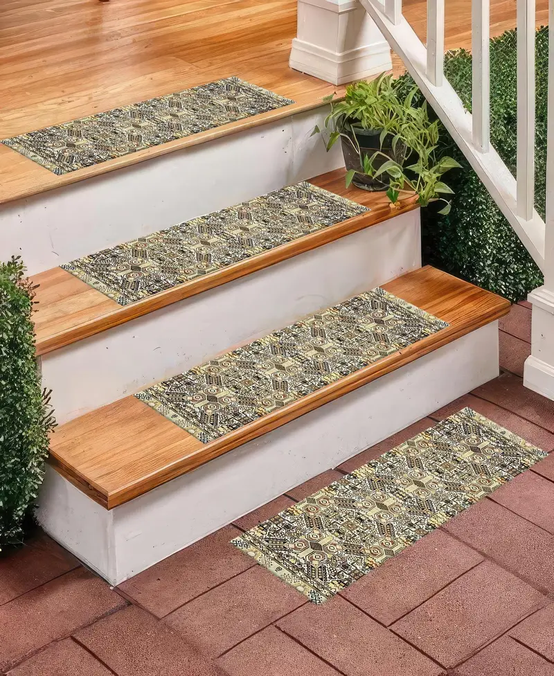 イエロー & ベージュのヴィンテージ プリント ステップ ラグ - 時代を超越したエレガンス
