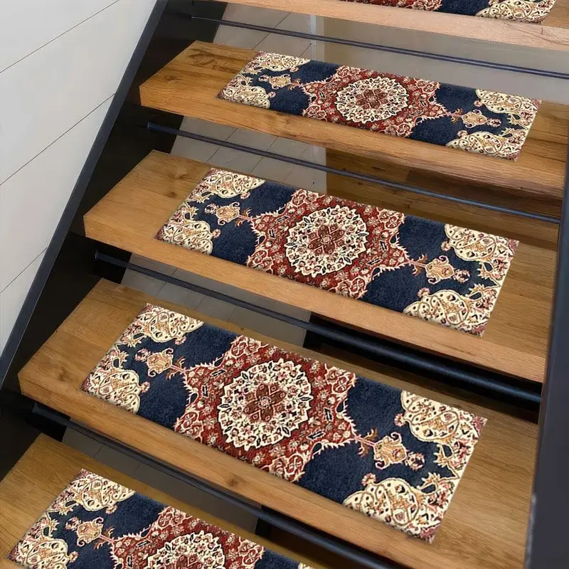 レッドフローラルヴィンテージプリントラグ、ターキッシュステップラグ、ネイビーブルーパターン