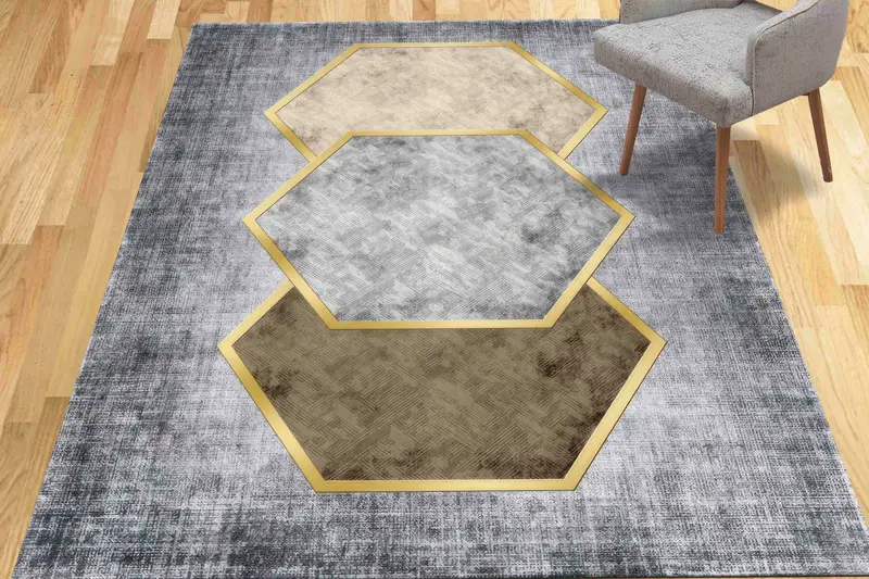 幾何学模様のゴールデンブラウンプリントラグ:モダン、ミニマル、ソフトトーン