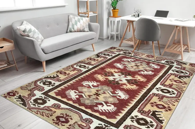 レッド、ブラウン、ベージュのトルコヴィンテージパターンプリントラグ - 時代を超越した装飾