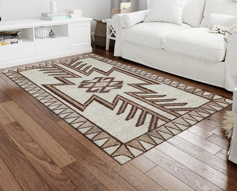 幾何学的なヴィンテージパターンブラウンベージュプリントラグ、モダンエレガンス