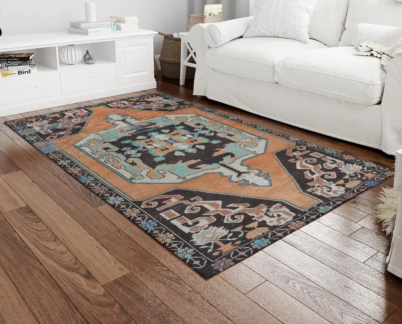 ベージュ & オレンジ ヴィンテージ柄エスニック プリント ラグ
