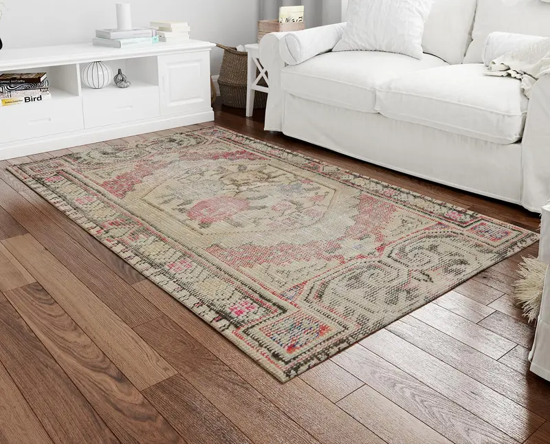 レッド、ベージュ、グリーンの花柄ヴィンテージプリントラグ、トルコ風の装飾