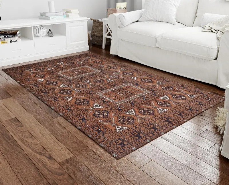 時代を超越したデザインのブラウン & ベージュの幾何学模様のヴィンテージ プリント ラグ