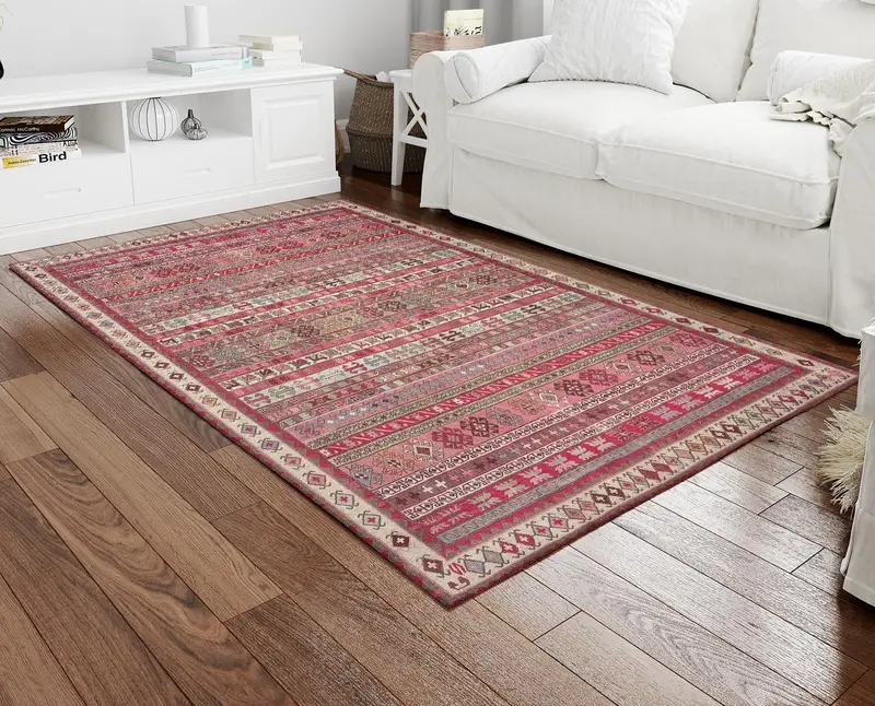 レッド&ピンクのトルコヴィンテージプリントラグ:ベージュのアクセント、時代を超越したデザイン