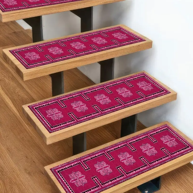ヴィンテージトルコデザインレッドピンクプリントステップラグ、時代を超越したエレガンス