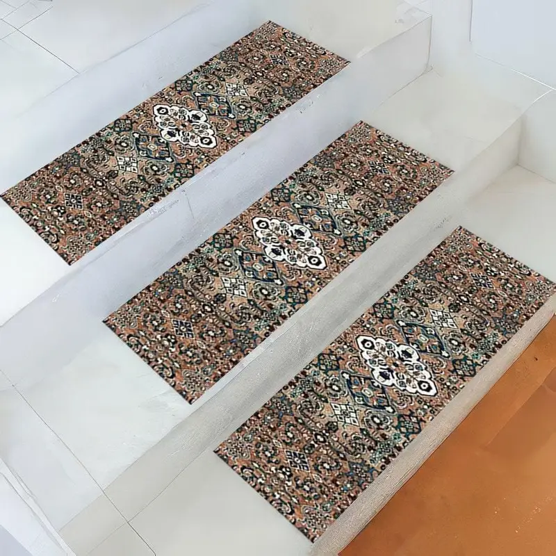 ヴィンテージブラウン&グリーンパターンステップラグ、モダンな住宅向けにプリント