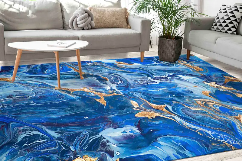モダンなラグジュアリーを演出するきらめくゴールドとネイビー ブルーのプリント ラグ