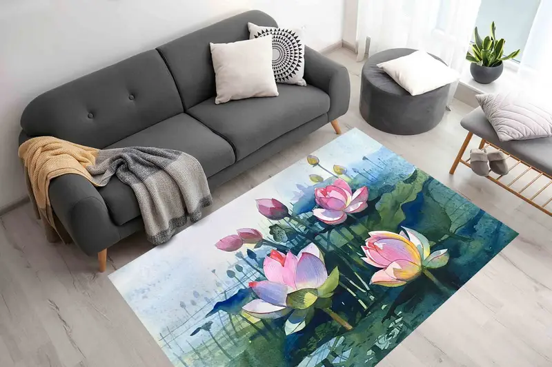 ピンクの花が描かれた現代的な水彩画のロータスプリントラグ