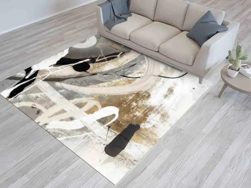 グレーとゴールドのモダンなプリントラグ: ソフトな色調、現代的なデザイン