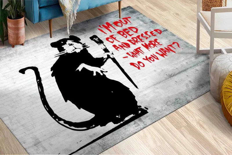 アーバン エッジ プリント ラグ: バンクシー マウス、ベッドから出ています