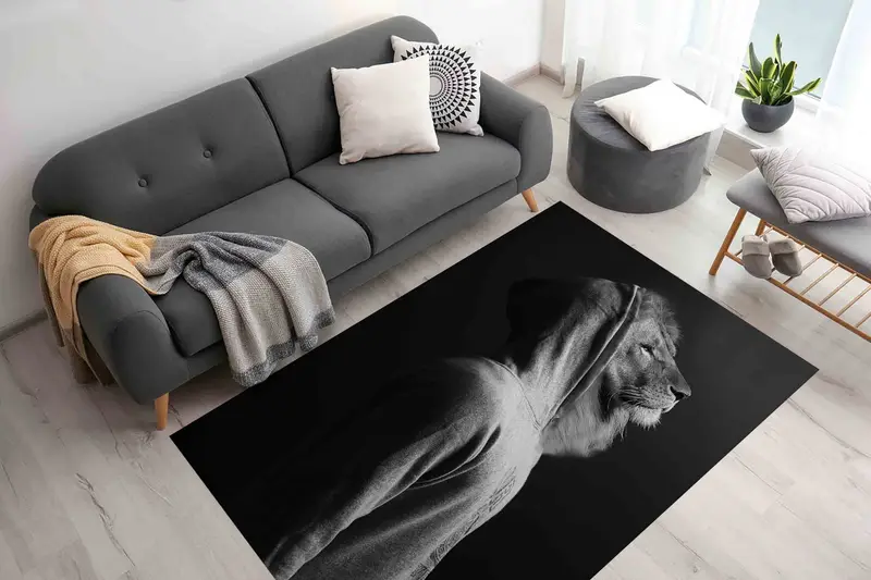 ライオンモチーフプリントラグ:モダンな抽象動物デザイン