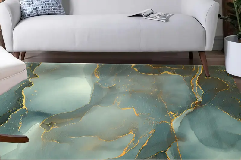 グリーン、ゴールドの大理石プリントラグ - モダンで豪華なきらめくデザイン