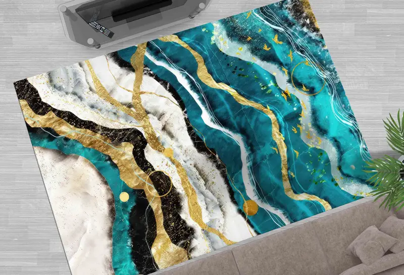 きらめくモダンな大理石プリントラグ、ブルー&ゴールドの豪華なデザイン