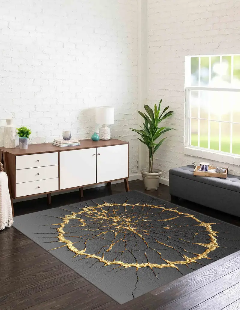 金継ぎゴールドブラックプリントラグ - 豪華なモダンデザイン