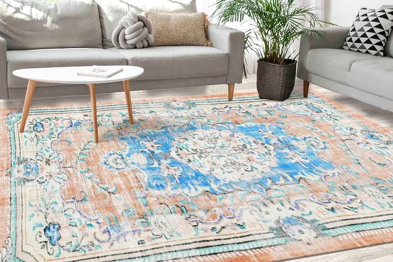 花柄オレンジ&ブルーの落ち着いたプリントラグ、ヴィンテージ色あせたデザイン