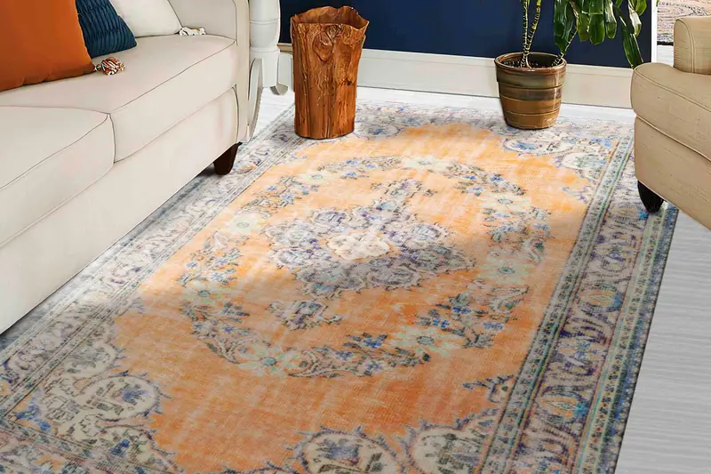 花柄の色合いのヴィンテージプリントラグ:オレンジ&ブルーのソフトトーン