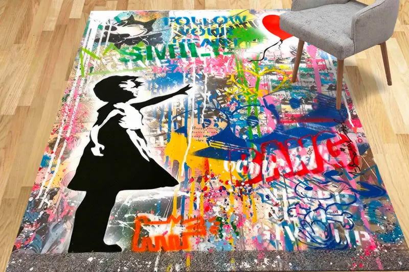 バンクシーにインスパイアされたバルーンガールデザインのミックスプリントラグ