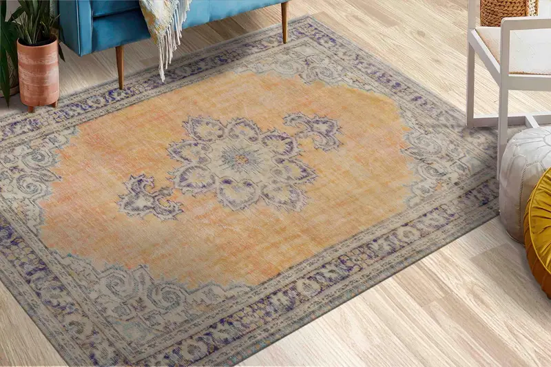 柔らかな花柄のマスタードメダリオンヴィンテージプリントラグ