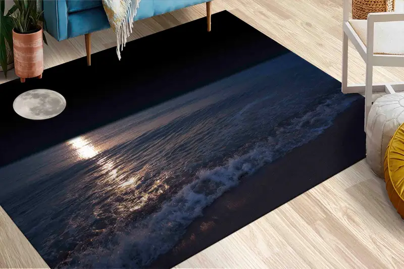 月明かりに照らされたビーチの風景プリントラグ: 海岸の静けさをご自宅に