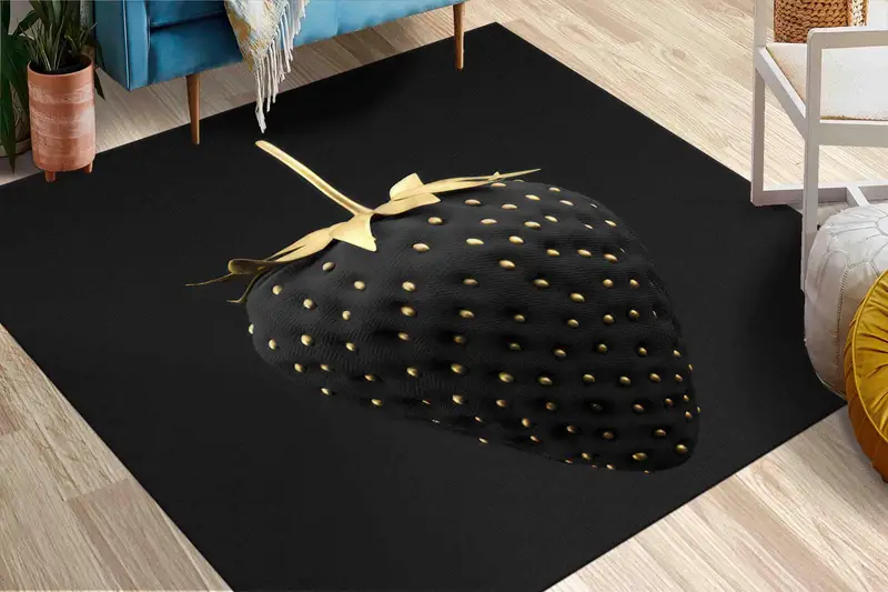 ブラックストロベリープリントモダンラグ:ゴールドアクセント、豪華な室内装飾