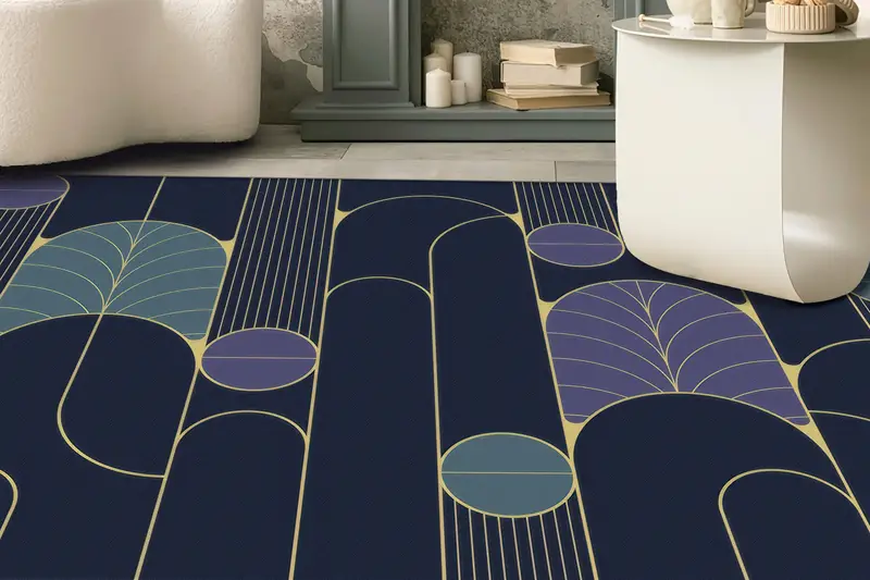 抽象的な形のモダンなプリントラグ、柔らかな質感、鮮やかなデザイン