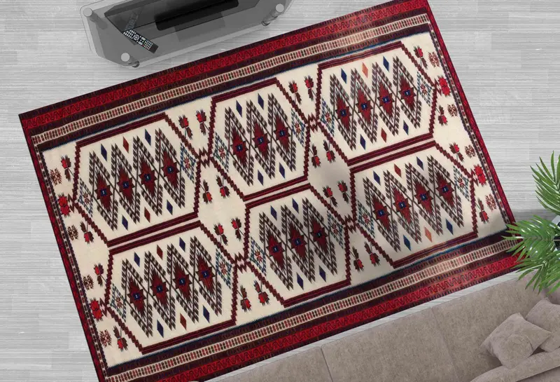 ヴィンテージキリム アステカ プリント ラグ: 幾何学模様 & モダンなデザイン