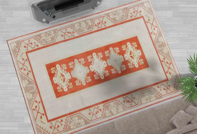 オレンジ、ベージュ、イエローの色合いのヴィンテージ幾何学模様プリントラグ