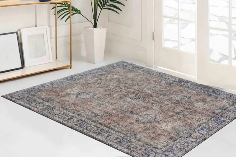 ネイビーブルーの花柄ヴィンテージプリントラグ、ブラウンアクセント、ソフトな質感