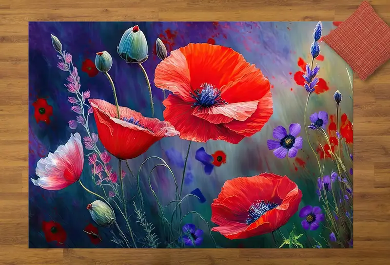 鮮やかな赤いケシの花柄プリントラグ、モダンなキッチンの装飾に