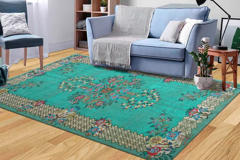 ヴィンテージメダリオンプリントラグ、花柄グリーン&ローズパターン