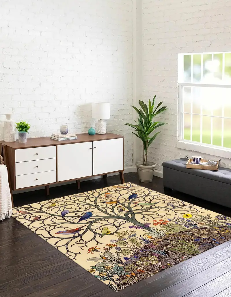 秋の鳥と花柄のプリントラグ - 自然からインスピレーションを得た装飾