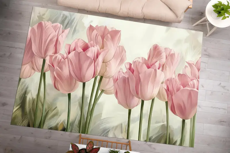 ピンクのチューリップの花プリントラグ - モダンな花柄のホームアクセント