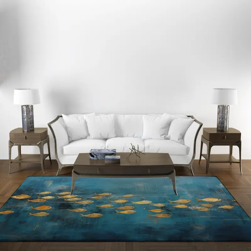 ブルーフィッシュモダンアニマルプリントラグ、ソフトな質感、ゴールドアクセント