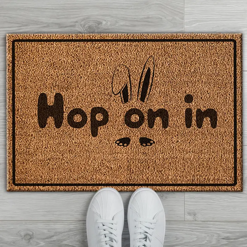 Hop On İn、ウサギの玄関マット: 玄関用のモダンなプリントラグ