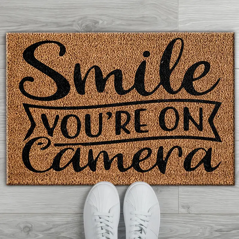 モダンカメラドアマット: 玄関用スマイルコイルプリントラグ