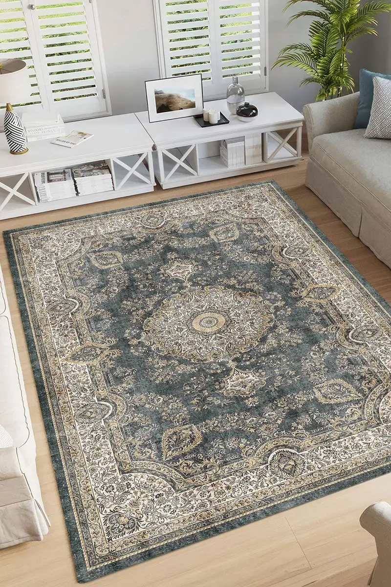 ヴィンテージ花柄プリントラグ、Kadife Tılsım デザイン、ソフトタッチ