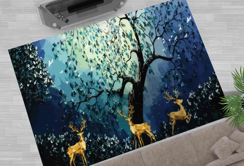 満月の下の金の鹿、高級プリントラグ、森の夜景