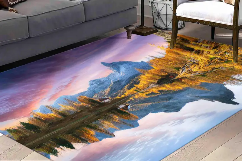 サンセットフォレストレイクプリントラグ:自然風景アート