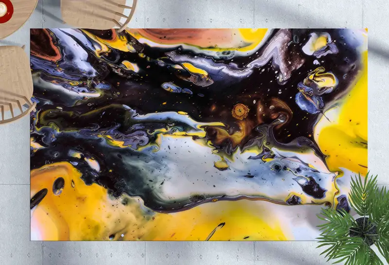 黄色の抽象的なオイル プリント ラグ、モダンで現代的なデザイン