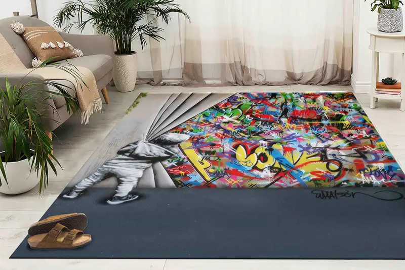 鮮やかなバンクシーグラフィティアートプリントラグ、モダンなホームアクセント