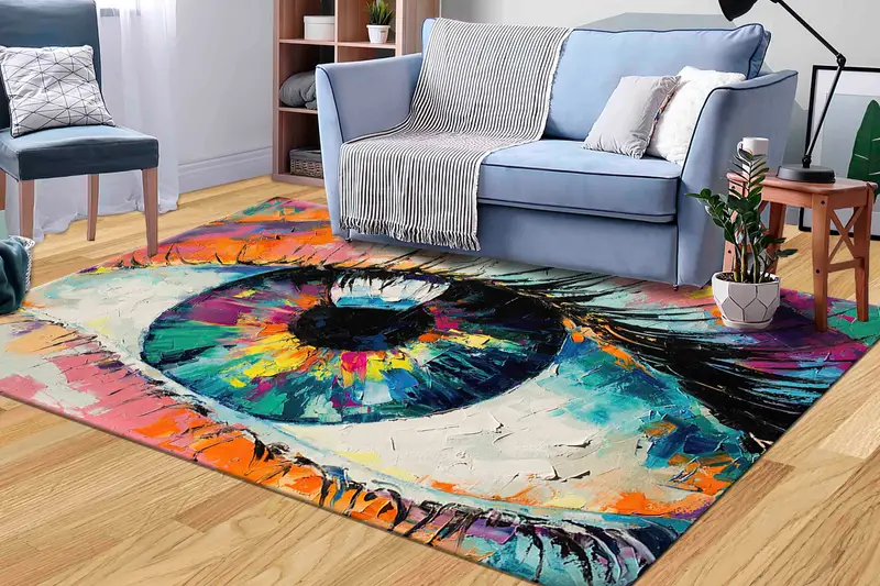 抽象的なアイデザインのモダンなプリントラグ、カラフルで現代的な装飾